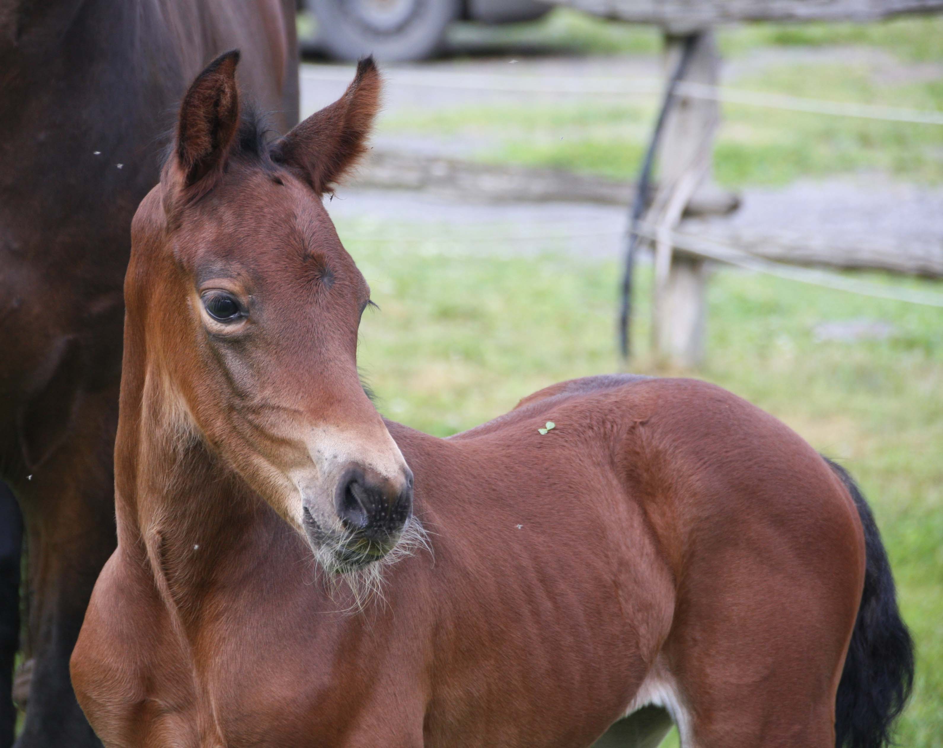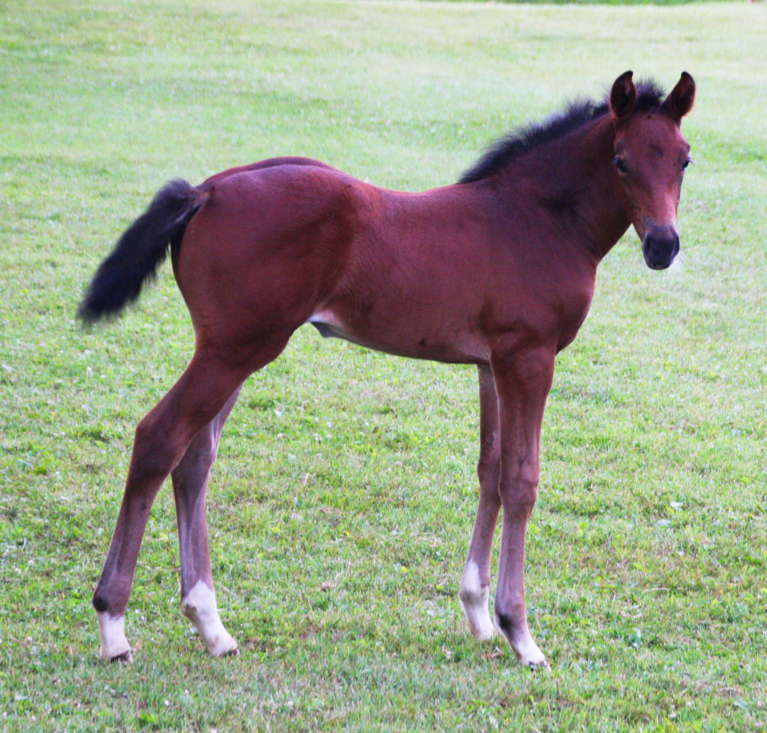 Born June 7, 2017 was the black Rhinelander filly “Dark Arts” (aka Ouija) by Diamond Stud, out of imported Hanoverian mare, Fontana by Feiner Stern. With a pedigree full of Grand Prix stars, Diamond Stud (GOV) offers North American breeders a rich heritage of top performers and proven rideability. Equally impressive was his gentlemanly demeanor in the barn and with people. Diamond Stud successfully completed the 70 day test at Silver Creek Farm in 2010. Some of his score highlights were: (Test Director) Character “10”, Temperament “9.5”, Willingness to work “9”, Constitution “9”, Rideability “8.5”; (Judges scores) Movement – walk “8.5”, trot ” 8.50″, canter “8.75”. Diamond Stud sired a high percentage of premium foals; his oldest offspring have been started under saddle and they are displaying not only very good gaits but also very high rideability. As Diamond Stud recently passed away, we feel fortunate to be able to offer this quality daughter of his for sale.