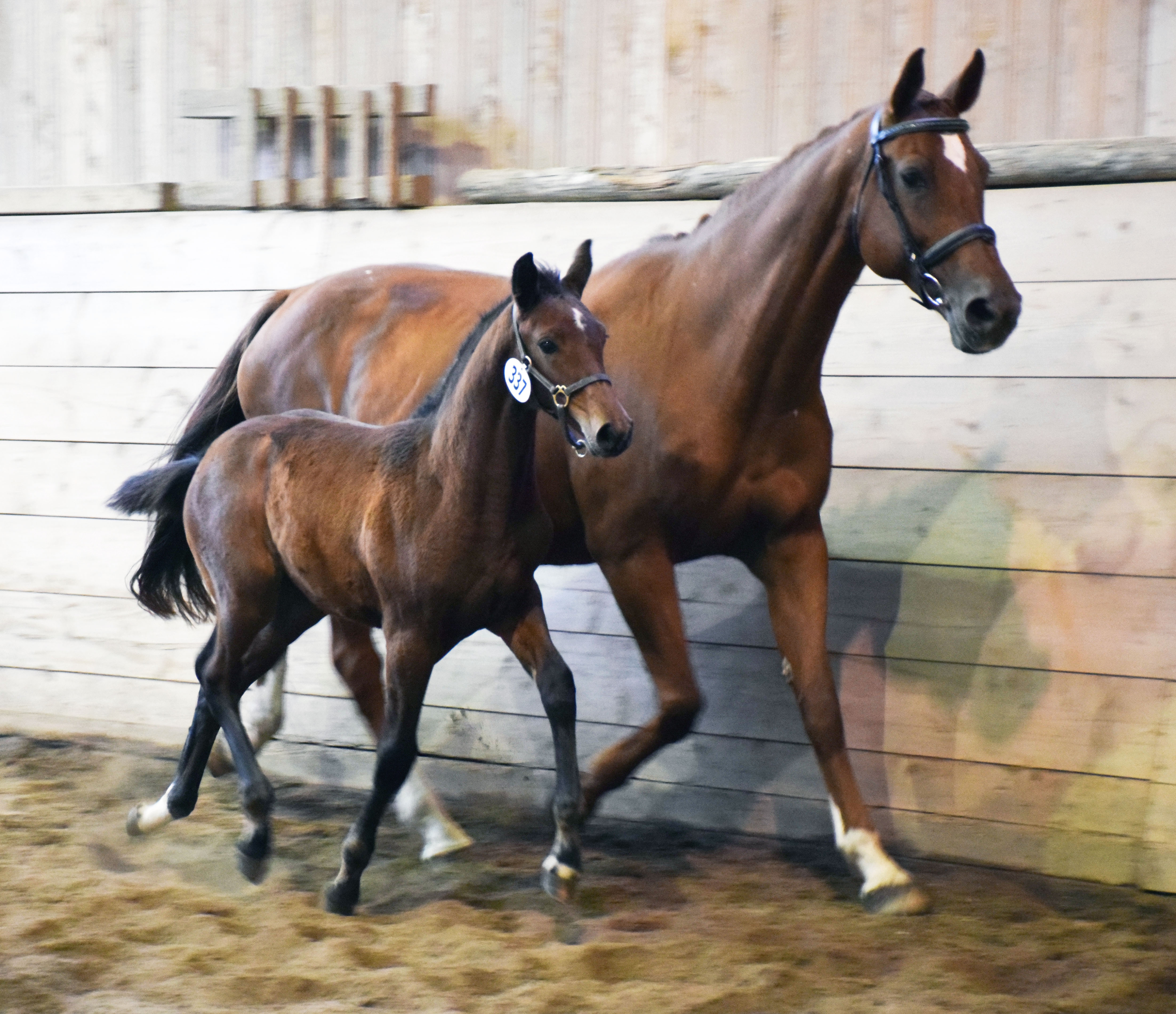 The dam Fontana (Feiner Stern/Erbherzog) received exceptional scores at her Mare Performance Test in Germany. She was awarded 9s for walk and trot, 8 for canter, 8 and 9 for character and rideability, and 7s for her jumping (even as a dressage-bred mare). She was an excellent broodmare and consistently produced quality, rideable offspring, one of which is competing at Prix St George with an amateur. We have retained her superb 3 year old filly by Bugatti as a future show horse and breeding prospect. A testament to the rideability of Fontana’s offspring is the fact that a number of them are mounts in the Royal Canadian Mounted Police musical ride which requires amateur-friendly horses that are ridden in large public performances by novice adult RCMP officers.
